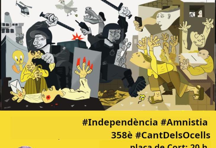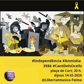 Aquest dijous, 14 de novembre, Música per la Llibertat convoca a la plaça de Cort de Palma a les 20 h el 'Cant dels Ocells', i serà la seva trobada número 358.