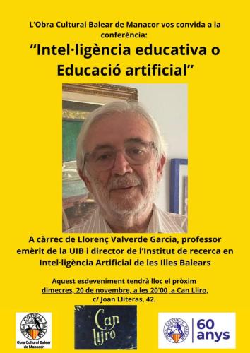 El pròxim dimecres, 20 de novembre a les 20:00 hores, tendrà lloc a Can Lliro de Manacor la conferència organitzada per l'Obra Cultural Balear de Manacor que tendrà com a protagonista a Llorenç Valverde i Garcia. El títol escollit pel conferenciant és: "Intel·ligència educativa o educació artificial".