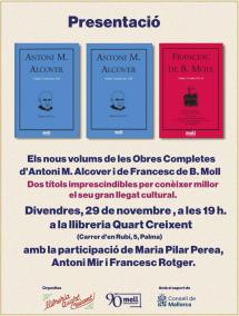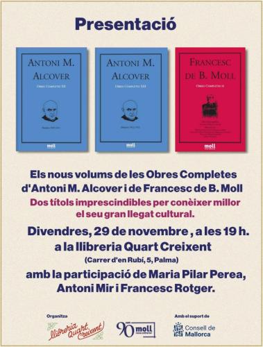 Els constants viatges d’Antoni Maria Alcover per terres de Menorca, Eivissa, Catalunya i el País Valencià, així com l’estranger, sempre amb l’objectiu de la seva monumental obra del Diccionari català-valencià-balear, i narrats per ell mateix, amb multitud d’anècdotes i curiositats, els recull Nova Editorial Moll en dos nous volums de les seves Obres completes, els números dotze i tretze de la col·lecció. El mateix segell, que compleix enguany 90 anys des de la seva creació, publica el novè volum de les Obres completes de Francesc de Borja Moll, que inclou un vocabulari de paraules característiques de Mallorca, Menorca i les Pitiüses. L’edició de tots tres llibres compta amb el suport del Consell de Mallorca.