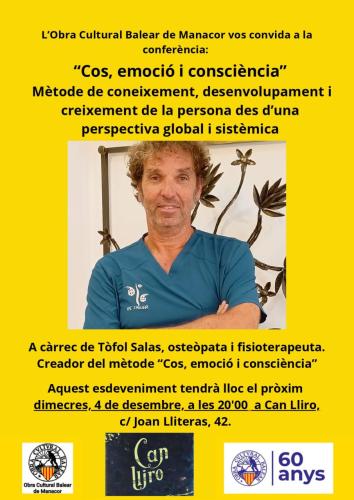 L’Obra Cultural Balear de Manacor ha organitzat la conferència 'Cos, emoció i consciència' que impartirà Tòfol Salas, el proper dimecres, 4 de desembre, a les 20 hores Can Lliro, dintre del cicle 'Dimecres de l’Obra'.