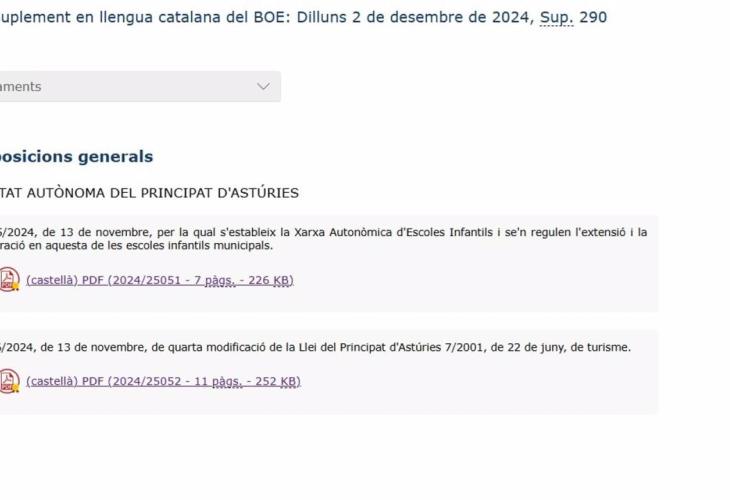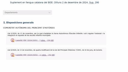 L'edició del BOE d'aquest dilluns tan sols recull les dues disposicions generals referents a dues lleis del Principat d'Astúries, motiu pel qual tan sols s'ha traduït el sumari de les mateixes i no el text normatiu.