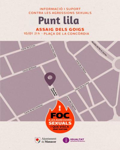 A més, hi haurà un Punt Lila, amb persones qualificades i identificades amb un distintiu per acudir-hi en cas de necessitar informació i suport contra les agressions sexuals. Aquest servei, impulsat pel departament d'Igualtat de l'Ajuntament de Manacor, estarà disponible per a qualsevol persona que necessiti informació o suport durant l’esdeveniment.