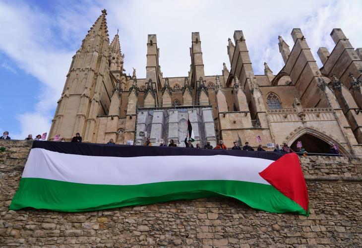 La plataforma Mallorca per Palestina ha desplegat una gran bandera palestina davall la Seu de Palma | Foto: Foto: Emilio Queirolo/UltimaHora