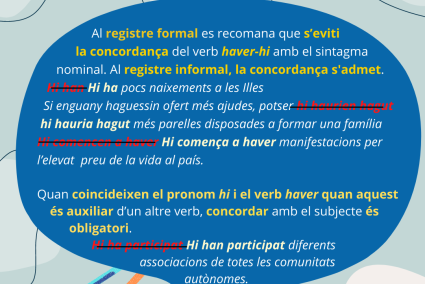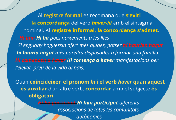 Aquesta variabilitat en l’ús del verb haver-hi ens demostra, un cop més, la importància que pot tenir saber distingir entre els registres informals i els registres més formals de la llengua, i ser més conscients de quines formes són adequades en cada context. Més endavant reprendrem aquesta qüestió en relació amb altres fenòmens lingüístics que ens ajudaran a reflexionar més sobre aquesta qüestió. Si, mentrestant, teniu dubtes sobre aquest verb o sobre qualsevol altre tema lingüístic, ens podeu escriure a l’adreça galmic@uib.cat i us respondrem tan aviat com puguem.