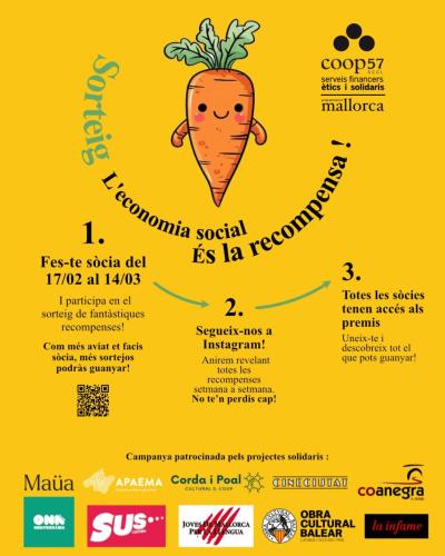 Per això es presenta la campanya 'L’economia social és la recompensa'. La campanya començarà el 17 de febrer i finalitzarà el 14 de març. Durant quatre setmanes totes les persones sòcies (les antigues i les noves) participaran setmanalment en el sorteig de diferents recompenses, que s’aniran publicant a través de l’Instagram @lacoop57Mallorca.
