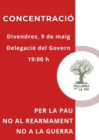 Amb ocasió de la commemoració els dies 8 i 9 de maig del Dia de les Nacions Unides en memòria de les víctimes de la Segona Guerra Mundial, la plataforma Mallorca per la Pau convoca una concentració davant Delegació del Govern espanyol a Palma per a manifestar «el nostre més enèrgic rebuig a la política de rearmament que tots els dirigents europeus, incluent-hi els nostres, estan portant a terme, i per a demanar que s’aturi l’escalada bèl·lica, tant ideològica com informativa com de mesures econòmiques que pretén que assumim com a natural, la possibilitat d’un conflicte bèl·lic a nivell europeu i per tant, a nivell mundial».