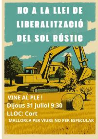 Des de la plataforma Mallorca per viure no per especular, s’ha fet una crida pel proper dijous, 31 de juliol, a assistir al ple de l’Ajuntament de Palma, per «instar els regidors a votar en contra de l'aplicació del Decret llei 3/2025 i deixar sense efecte aquesta greu modificació de la normativa urbanística, aprovada el passat 7 de juliol pel PP i VOX al Parlament».