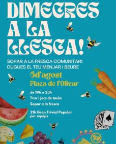 Aquest dimecres, dia 6 de juliol, de 19 a 23 hores, tendrà lloc a la plaça de l’Olivar de Palma la primera trobada d’agost del Dimecres a la llesca!, sopar a la fresca comunitari.