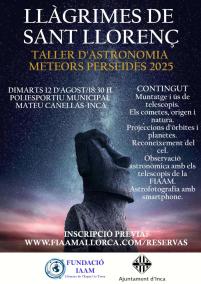 El proper dimarts, 12 d’agost, el Poliesportiu Municipal Mateu Cañellas d’Inca acollirà una nova edició del taller d’astronomia 'Llàgrimes de Sant Llorenç', organitzat per la Fundació IAAM en col·laboració amb l’Ajuntament d’Inca. L’activitat, que començarà a les 18.30 h, convida tota la ciutadania a endinsar-se en el fascinant món de l’astronomia coincidint amb un dels fenòmens més espectaculars de l’estiu: la pluja de meteors dels Perseids.
