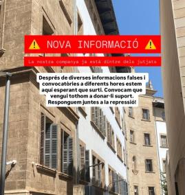 Després de més de dotze hores sense informació i amb la persona detinguda incomunicada, els activistes concentrats aquest divendres al matí davant dels Jutjats de l’Avinguda d’Alemanya han aconseguit saber que passarà a disposició judicial cap al migdia.
