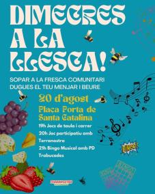 Aquest dimecres, dia 20 d’agost, a partir de les 19 hores, tendrà lloc a la plaça de la Porta de Santa Catalina de Palma la tercera trobada d’agost del Dimecres a la llesca!, sopar a la fresca comunitari.