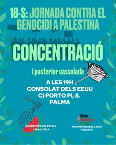 Aquest dijous, dia 18 de setembre, Palma acollirà una jornada de mobilització sota el lema 'Contra el genocidi a Palestina'. La convocatòria, organitzada pels col·lectius Marxes per Palestina a Mallorca i Moviment Global a Gaza Mallorca, tendrà lloc davant el Consolat dels Estats Units (carrer de Portopí, 8), a partir de les 19 hores.