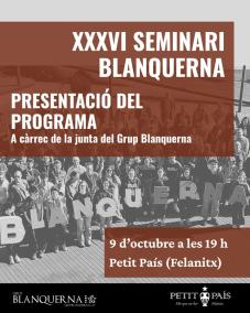 El dijous 9 d'octubre, a les 19.00 hores al bar Petit País de Felanitx, el Grup Blanquerna presentarà el programa de la 36a edició del Seminari Blanquerna, que es farà els dies 1 i 2 de novembre a Can Picafort.