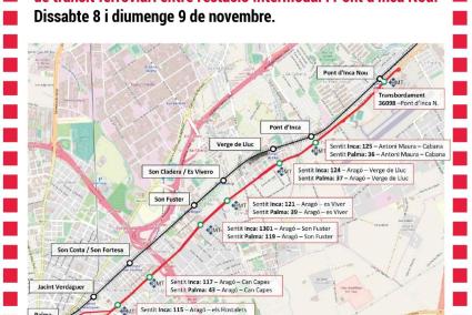 Serveis Ferroviaris de Mallorca (SFM) ha recordat que suprimirà el trànsit ferroviari entre l'estació Intermodal i Pont d’Inca Nou en tots dos sentits aquest cap de setmana (dissabte 8 i diumenge 9 de noviembre) a causa de les obres de remodelació del pas elevat del carrer del Greco, al costat de l'estació de Verge de Lluc. Com a alternativa, els usuaris podran disposar d’un servei especial d’autobús en aquest tram que SFM ha previst en col·laboració amb l'EMT de Palma.