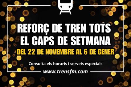 Serveis Ferroviaris de Mallorca (SFM) programa trens especials de reforç durant tots els caps de setmana des d'aquest dissabte, 22 de novembre, fins al diumenge 4 de gener, i que inclouran també tant el 8 de desembre com el 6 de gener, ambdós festius. SFM amplia el calendari d'aquest servei especial que va oferir per primera vegada l'any passat i avança el començament a aquest dissabte, dia 22, per a coincidir amb l'encesa de llums a Palma, que tendrà lloc a la plaça d'Espanya a les 19 h.