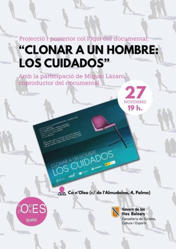 Dins el marc del Dia Internacional de l’Eliminació de la Violència Contra la Dona, Homes per la Igualtat Mallorca presenta el dijous 27 de novembre el documental ‘Clonar a un Hombre. Los cuidados’ a les 19.00 hores a Ca n'Oleo amb a la presència de l'investigador, docent i divulgador Miguel Lázaro, que és guionista del documental que va dirigir Ivan Roiz.