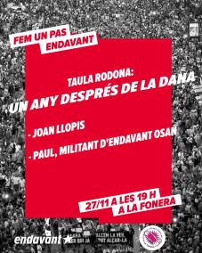 Aquest dijous, 27 de novembre, a les 19 hores, Endavant OSAN organitza la taula rodona 'Un any després de la Dana' a l'Ateneu Popular La Fonera de Palma (carrer Manacor, 36). Quan fa un mes que s'ha complert aquest primer aniversari de la pitjor catàstrofe de la històrica recent del País Valencià i que va costar la vida a més de 200 persones i una destrucció de pobles i barris que encara no s'han recuperat, es vol analitzar què ha passat durant aquest any, com ha respost la societat valenciana, com ha estat la mobilització i organització per a respondre a la Dana i a la incompetència i criminalitat del govern de Carlos Mazón, etc.