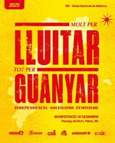 Per a la Diada de Mallorca, les organitzacions que formen l'Esquerra Independentista de Mallorca (EIM) --la CUP, Arran, SEPC, Endavant, COS i Alerta Solidària-- han fet pública la convocatòria d’enguany de la manifestació que serà el dimarts, 30 de desembre, a les 18.00 hores i partirà del Passeig del Born de Palma.