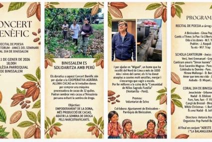 El proper diumenge, 11 de gener de 2026, a les 18.00 hores, es farà un concert a benefici de dos microprojectes solidaris amb Perú, a l'església parroquial de Binissalem.