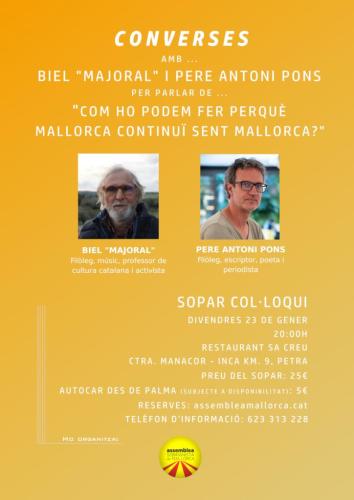 L’Assemblea Sobiranista de Mallorca (ASM) organitza un nou sopar col·loqui el proper divendres, 23 de gener, amb Biel Oliver 'Majoral' i Pere Antoni Pons, sota el títol 'Com ho podem fer perquè Mallorca continuï sent Mallorca'.