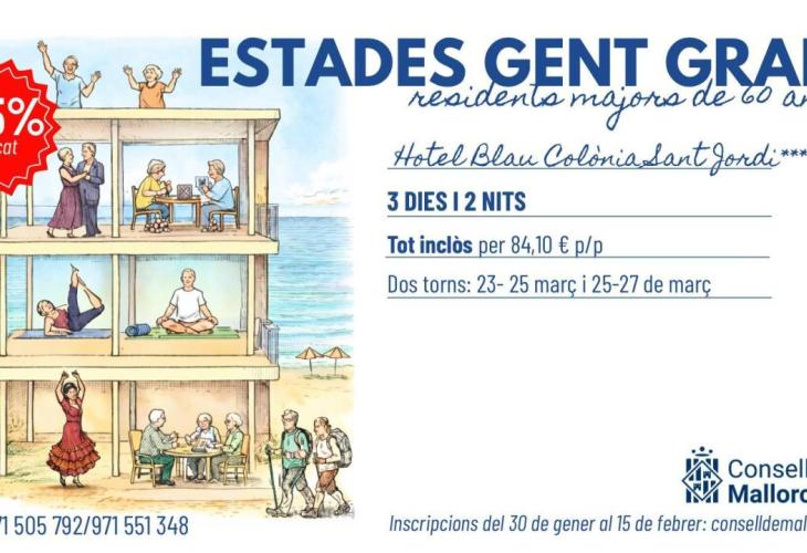 El Consell de Mallorca ha obert el termini de preinscripcions per una nova edició de les ‘Estades per a la gent gran’, una iniciativa que torna aquest 2026 amb un programa d’activitats reforçat i una nova planificació en el calendari per arribar a més persones durant l’any. Aquesta primera convocatòria és per als dies 23–25 i 25–27 de març a l’Hotel Blau Colònia Sant Jordi i comptarà amb 1.000 places per a persones residents a Mallorca de 60 anys o més. Les places es distribuiran en dos torns de 500 participants, i cada persona seleccionada disposarà de plaça per acompanyant.