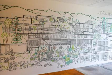 L’obra, situada a l’entrada de l’OCDS, és una creació de l’artista Andrea Moretto i de l’estudiant de la UIB Anton Boix i neix del taller participatiu «Futurs ecosocials a la UIB», desenvolupat en el marc de les jornades «Actuem ara! Emergència climàtica en l’era de la desinformació». El mural dona resposta a la pregunta «Quins futurs sostenibles imaginam per a la UIB?» i recull, en clau artística, les idees, les inquietuds i les propostes sorgides del procés participatiu.