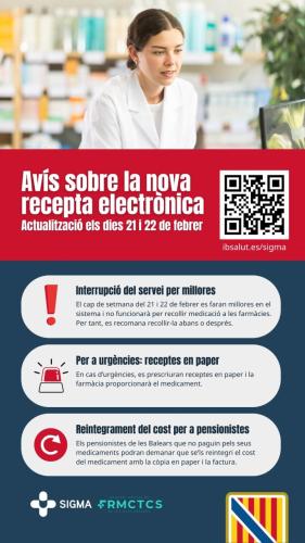 El cap de setmana (21 i 22 de febrer), el Servei de Salut durà a terme el canvi de sistema de recepta electrònica passant de l’actual RELE a SIGMA (sigla de Sistema Integral de Gestió de Medicació Ambulatòria), transició que obliga a interrompre l’ús de la targeta sanitària per a prescriure i obtenir medicaments aquests dos dies. «El canvi servirà per a introduir un conjunt de millores per als pacients en matèria de interoperabilitat, i també amb relació a la qualitat, la seguretat i l’eficiència del procés de prescripció de medicaments», han explicat.