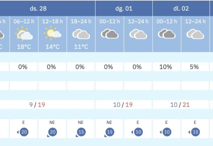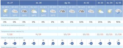 L’Agència Estatal de Meteorologia (AEMET) preveu un canvi de temps per aquest pont. L’allunyament d’un anticicló i l’arribada d’un tàlveg provocaran un augment de la nuvolositat i un lleuger descens de les temperatures, tot i que les precipitacions seran poc probables.