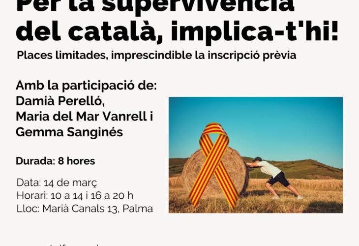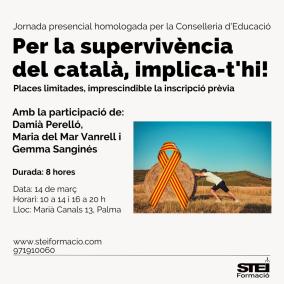 L’STEI Formació ha programat per al pròxim 14 de març la jornada presencial «Per la supervivència del català, implica-t’hi!», una proposta homologada per la Conselleria d’Educació que tendrà lloc a l’Escola de Formació i Mitjans Didàctics, al carrer Marià Canals, 13, de Palma.