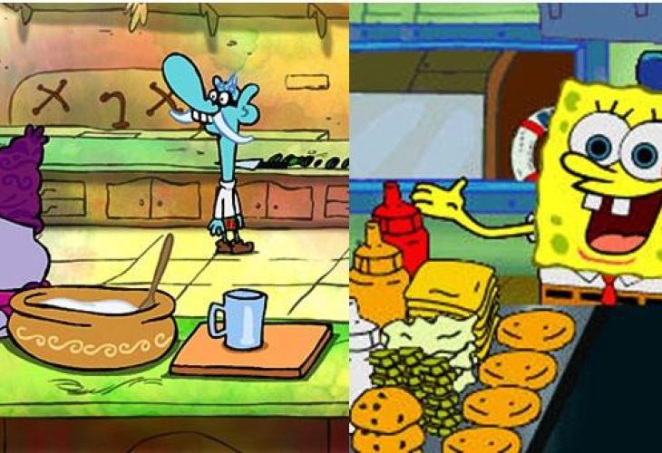 La segona sèrie d'animació que veurem avui, i que també gira entorn a la cuina, és Bob Esponja, que curiosament comparteix guionista amb l'anterior. Bob Esponja és el cuiner del "Crustáceo Cruijiente" on prepara exclusivament la seva única recepta: les Burguer Cangreburger (krabby Patty), elaborades amb pa, tomàtiga, cogombre, lletuga, algues, gelatina de grumer, carn i l' ingredient secret (molt d'amor); que episodi a episodi tracta de descobrir l'arxienemic Plankton... de forma infructuosa, cal a dir.