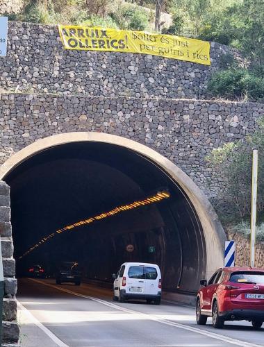 Apareix una pancarta amb el lema "Arruix sollerics. El poble és just per guiris i rics" penjada a la bocana del túnel. Tot i que no se sap l'autoria, el missatge s'ha fet viral per xarxes i via WhatsApp acompanyat d'un text que anima a anar a les urnes dia 28 de maig, ja que "Sóller necessita fer front de manera urgent a la gentrificació", expressen. Segons el text, s'acusa els governants locals actuals "de no fer res", per això consideren que "els sollerics i solleriques tenim una cita important el proper 28 de maig i votar al partit que proposi les mesures més valentes", diuen.