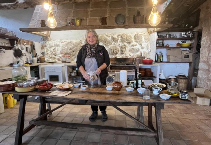 La primera aturada de la ruta circular la fan en una marjada plena d’oliveres, en la qual es troben diversos panells que expliquen les seves particularitats. Entre altres, Dols comenta que «aquí els assistents coneixen les característiques de l’olivera, explicant, per exemple, que una olivera són dos arbres, i que la mallorquina té el doble de producció que la resta». En els panells també es parla de la història de l’olivar, clarificant, entre altres, que té fins a 525 oliveres. A més, en aquesta marjada es troba ‘La senyora’, «que és l’olivera més gran que tenim, és mil·lenària, i els presents poden mesurar la seva amplària». Per altra banda, durant el camí els visitants es troben amb ovelles i gallines, sobre les que Dols comenta que «s’encarreguen de netejar el terreny i les oliveres, ens ajuden».