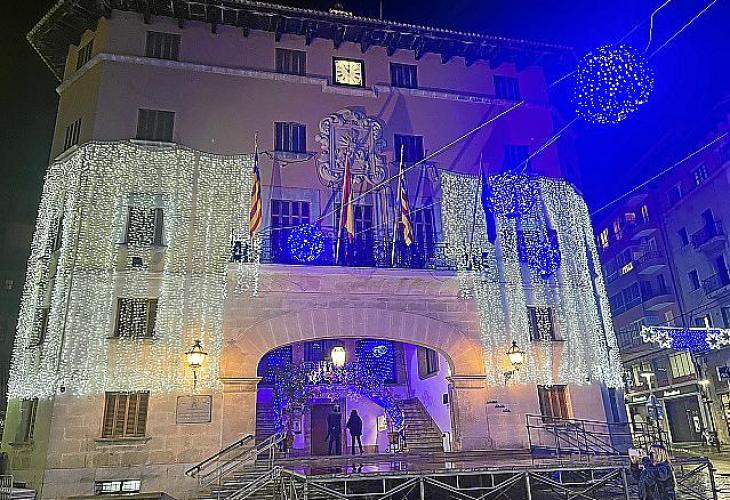 SOLLER - L’encesa dels llums de Nadal fa que Sóller entri ja en ambient de festes. Els Xeremiers de Sóller foren els encarregats de pitjar el botó divendres capvespre a Plaça. La façana de l’Ajuntament amb els llums de Nadal encesos des del passat divendres | Foto: ARCHIVO