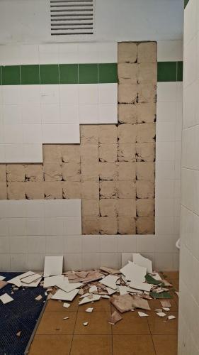 Basta veure les fotos per veure les rajoles a terra d’una de les parets del vestidor, portes en mal estat i altres desperfectes que comporten un autèntic perill pels usuaris, especialment pels nins i nines del futbol base, però per a tots en general.