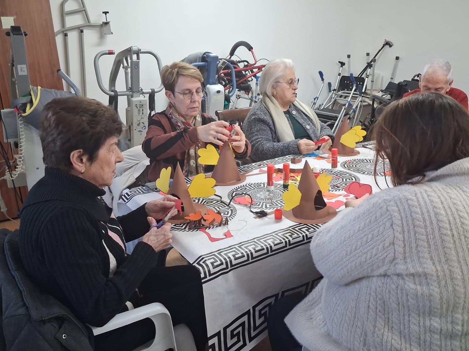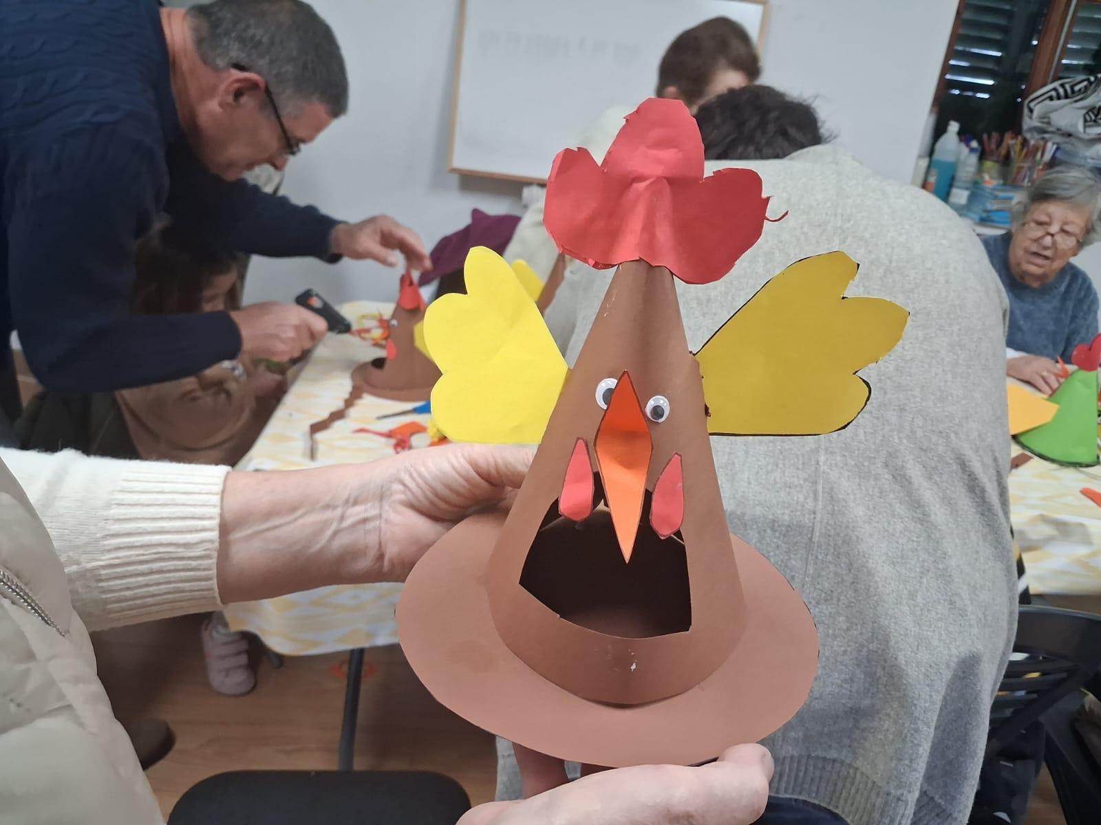 Les 16:30 era l’hora que marcava el fulletó com a inici de l’acte i fou quan la gent començà a arribar a la sala, que estava preparada amb cartolines, tisores i pistoles de silicona i el més important, una taula reservada pel menjar i els beures per berenar en acabar. Una estona després, la sala es començà a omplir no només de persones majors sinó de joves i infants, on uns i altres s’endinsaren a la feina, tot i això, sense deixar de conversar i gaudir de la companyia, l’objectiu de l’activitat.